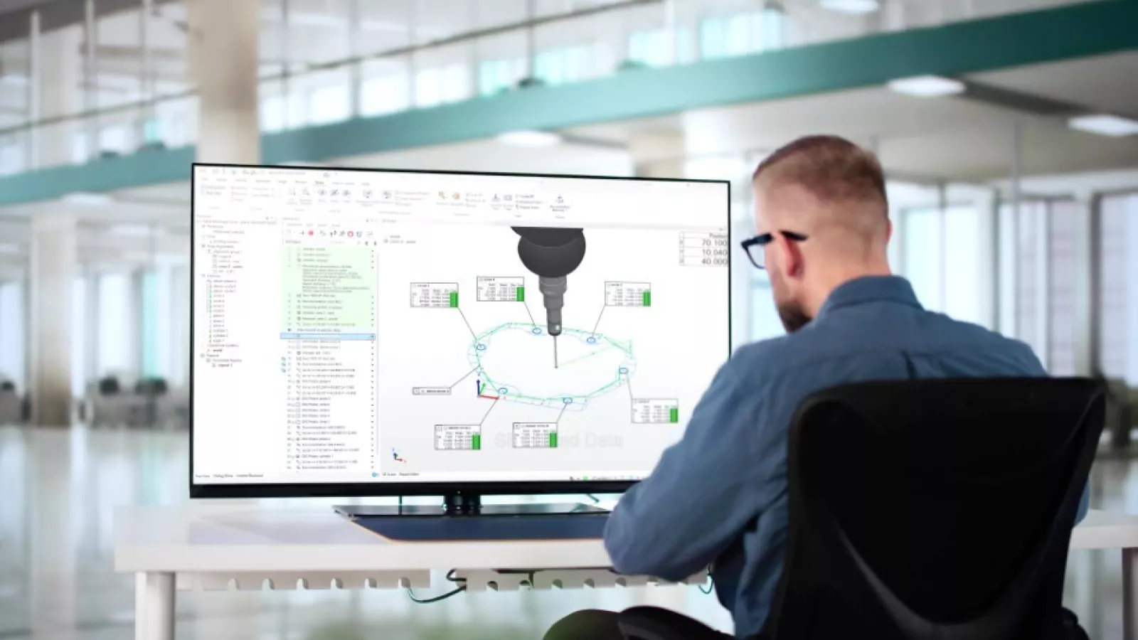 A metrologist leveraging PolyWorks|Inspector's no-code CMM programming workflow while viewing a 3D CAD model on a screen.