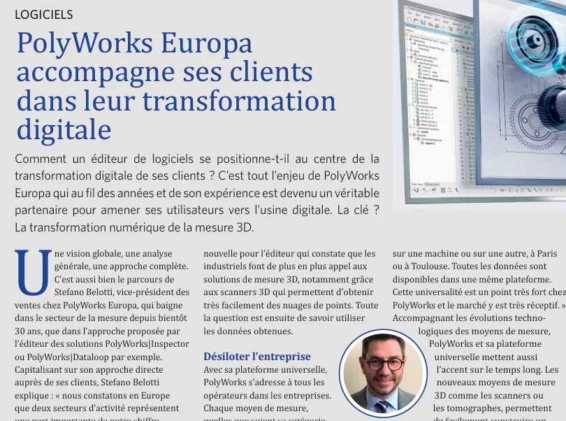 Dans une interview avec Stefano Belotti, vice-président des ventes, publiée dans Contrôle Essais Mesures, l'accent est mis sur l'approche globale et innovante de PolyWorks®.