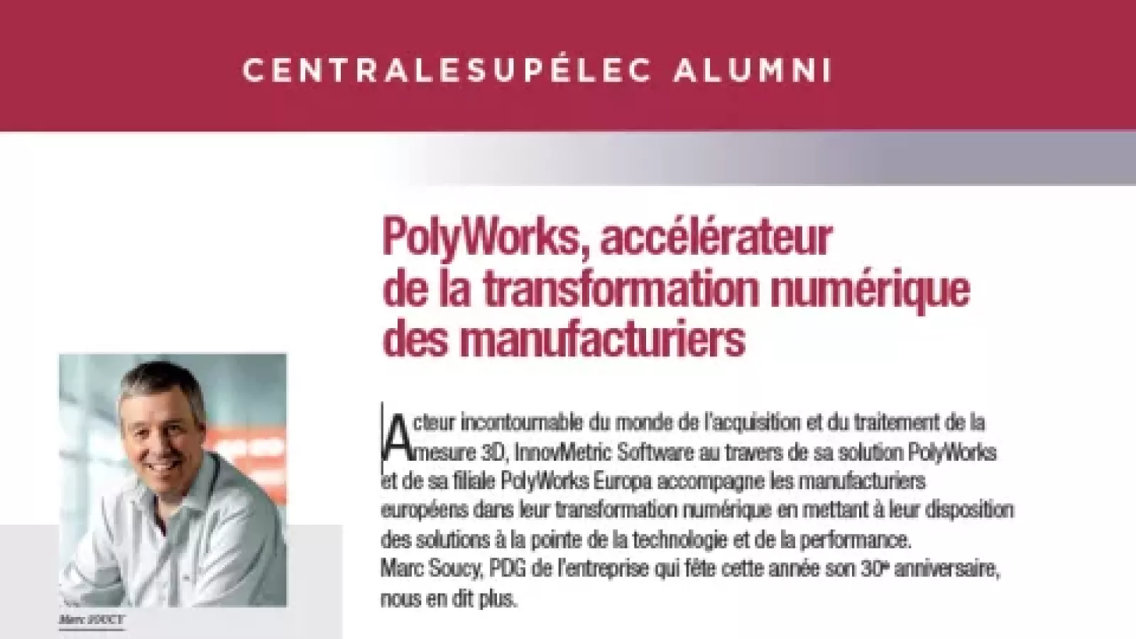 Dans le dernier numéro de la Revue CentraleSupélec Alumni n°21, PolyWorks® se voit honoré en tant qu'accélérateur majeur de la transformation numérique des industriels.
