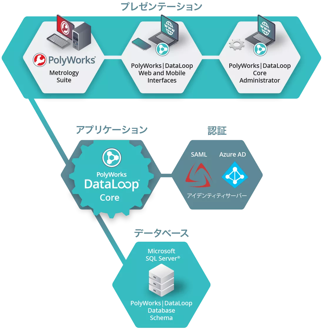 PolyWorks|DataLoopは、サーバーとソフトウェアの構成が必要になります。下図に、PolyWorks®ソフトウェア間の相互通信状況、Microsoft SQL Serverとの通信状況を示します。